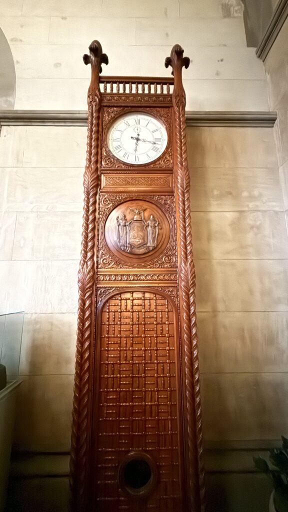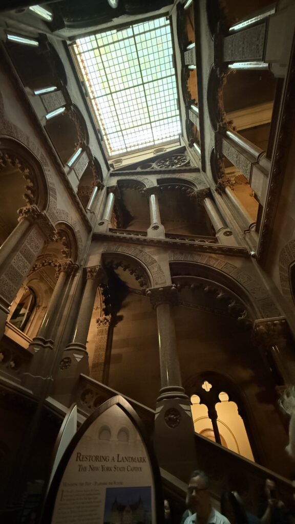 This State Capitol is…unique. But hey, isn’t all of New York? It has a lot of interesting “Easter Eggs,” pointed out by our tour guide, for example the Westchester marble, hand cut by Sing Sing prisoners; medieval, gothic, Islamic, and Renaissance themes; intricate carvings along the staircase and throughout the chambers. When work began, electric lighting did not exist, but by the 1880s the Capitol was one of the first public buildings in America to have electricity.