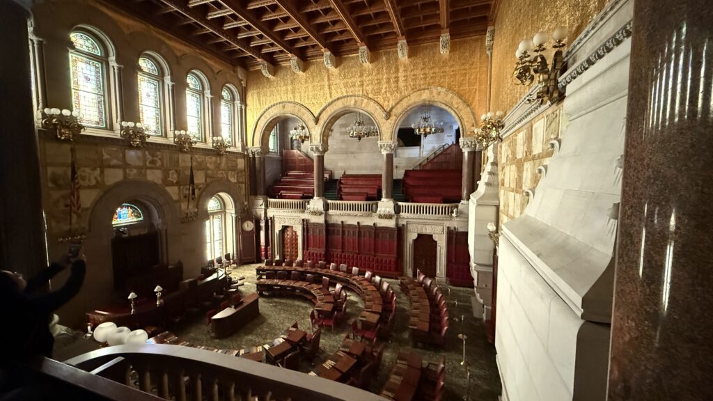 In 1899, when Theodore Roosevelt became the 33rd Governor of New York, he deemed the construction of the Capitol complete and halted any further work. Crafters stopped in the middle of their stone work, which the tour guide pointed out to us in one of the chambers. Big blocks of stone meant to be carved into framing around the room remain as mere blocks next to beautiful filigree, flowers, and other carvings, as stone carvers were sent home before they finished the job.