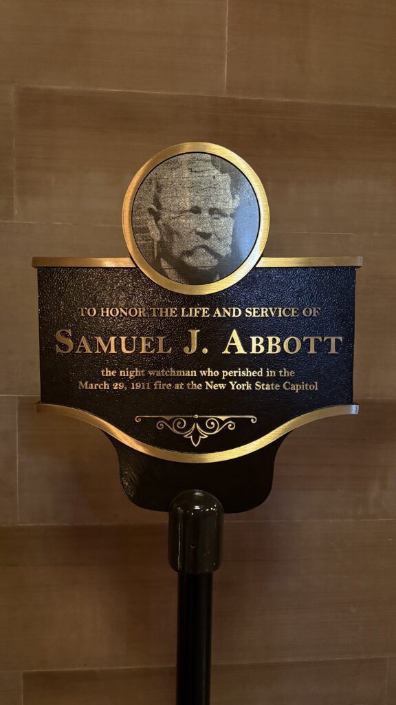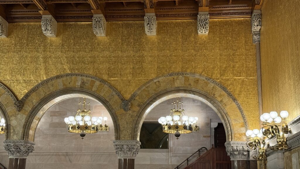 Rumors had surfaced that the contractor on the coffered ceiling in the Assembly had used paper maché and painted it to look like wood instead of real oak panels, turning an enormous profit. It turned out the rumor was true, which was established after the fire of 1911. While it confirmed the scandal, the paper maché turned out to be a blessing in disguise. Firemen poured water into the assembly chamber to prevent the fire from spreading throughout the rest of the building, and the paper maché absorbed the water, fell in pieces from the ceiling, and saved this room from destruction. Again, things that make you go “hmmmm.”
