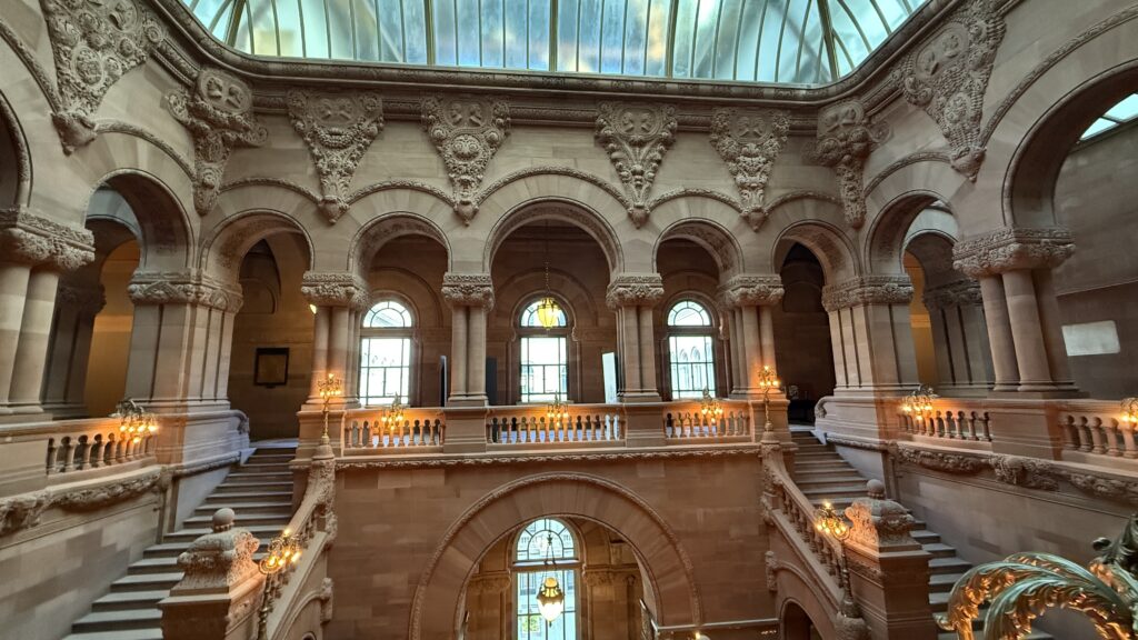 There were five architectural influences by the time they finished the State Capitol of New York 32 years (let that sink in) after it was started, at a cost of $25 million dollars–one of the most expensive buildings ever built in the country at that time. Each architect had their own unique style, creating additional delays and resulting in a final building which fuses French Renaissance and Victorian modified Romanesque styles that somehow works. New Yorkers are proud of the monstrosity, and rightly so. Though the combined efforts are a bit messy inside, the building has some extraordinary features that in some way work together to create an exquisite piece of art and a national Historic treasure.