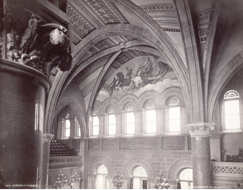 Within one year after opening, assembly members started finding dust and even a large stone on their desks due to a structural issue with the vaulted ceiling. One ton of stone was removed and replaced with 60 tons. Throughout the 1880s, several investigations delved into the structural failure. In 1888, it was decided to remove the open arched ceiling and replace it with flat coffers. Unfortunately, the beautiful paintings by artist Hall were covered by the lowering of the ceiling, placing them out of public view forever.