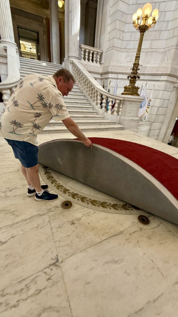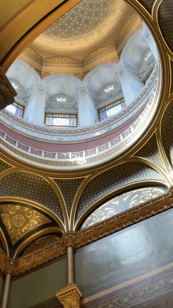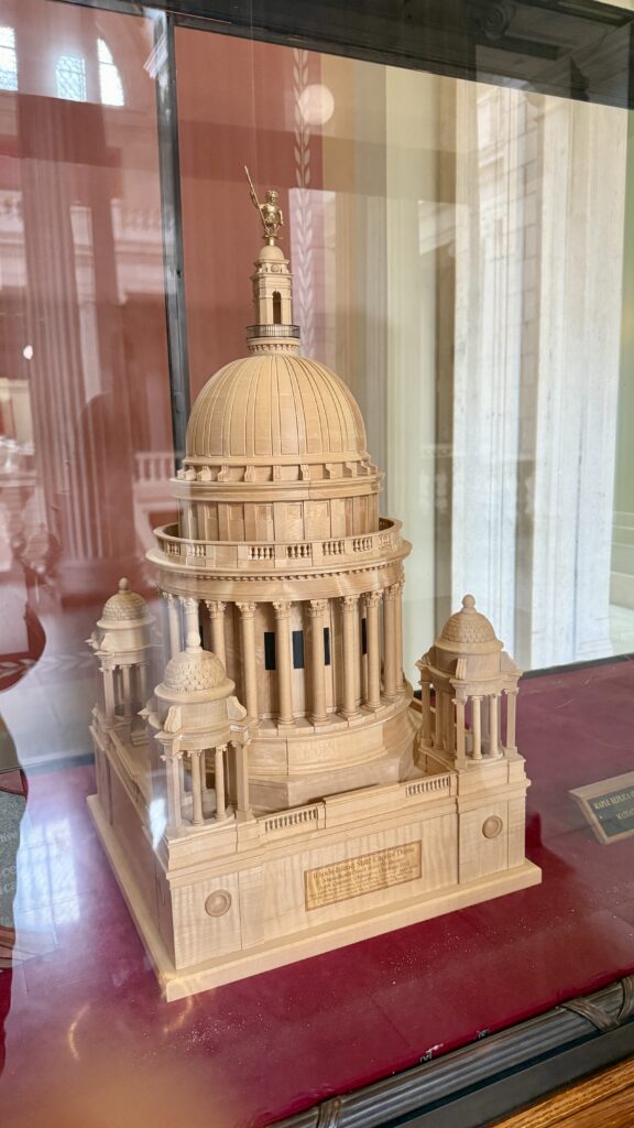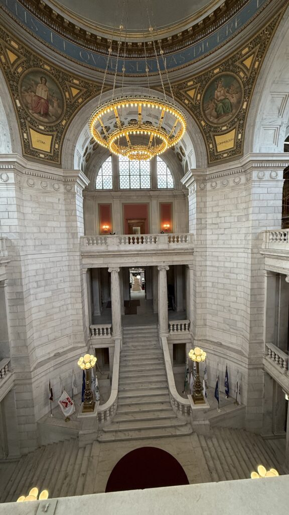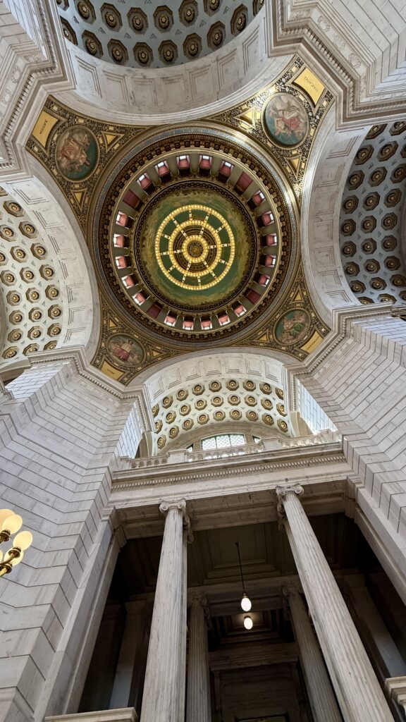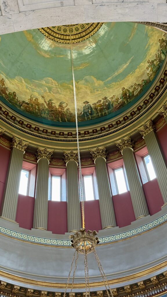 The Senate Chamber looks bigger than the House in these pictures, but it’s actually smaller. There are 38 members of the Senate. Inspired by the Pantheon in Rome, this room has been restored to its original colors and finishes. Uniquely, the senate gallery is above the rostrum, meaning those watching from above cannot see the speaker. In all our tours, this was the first Capitol we have seen with that design.
