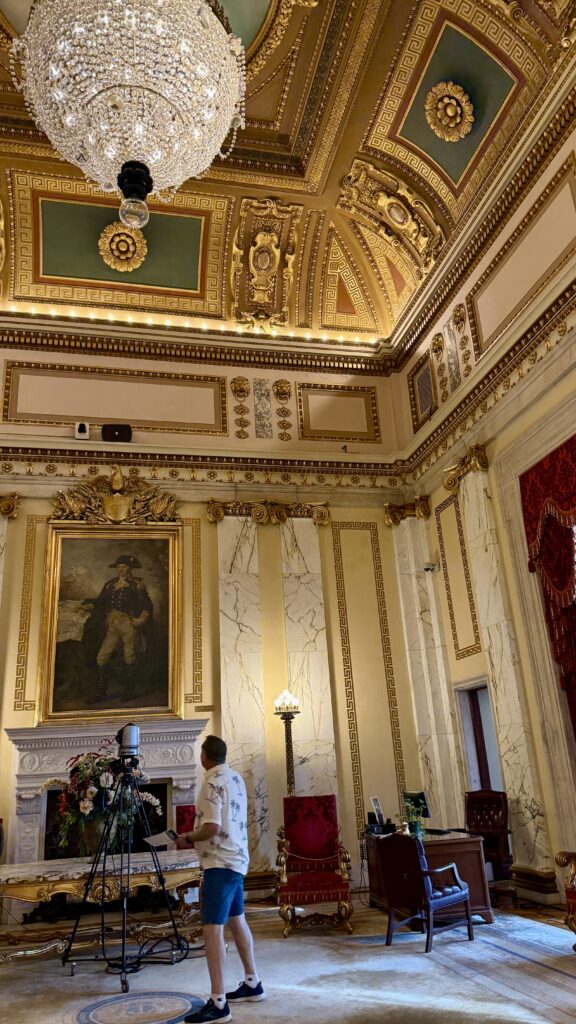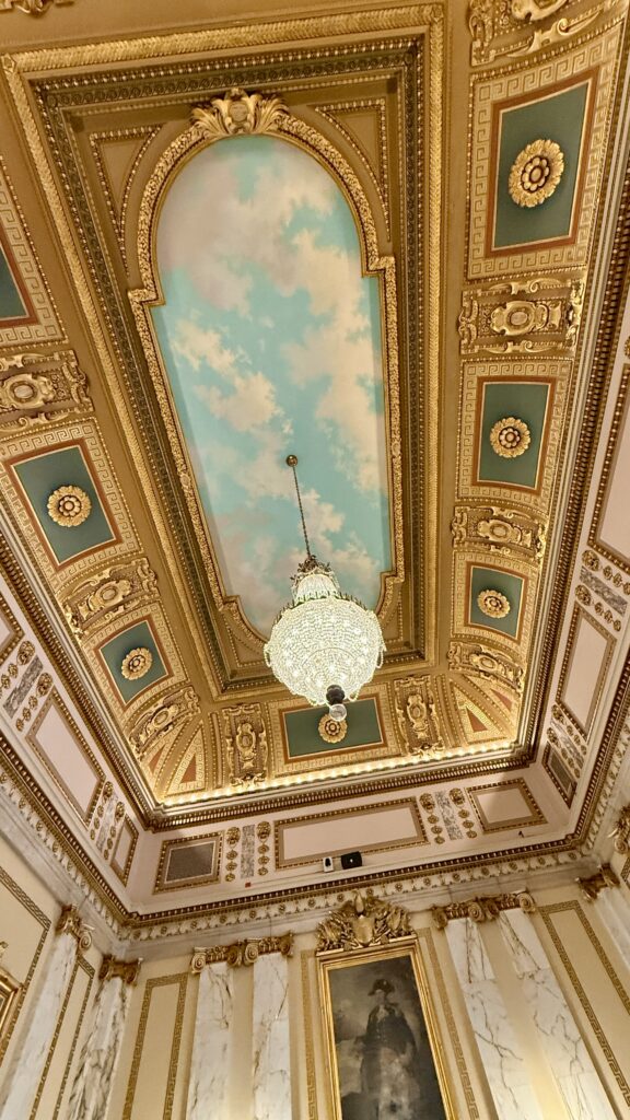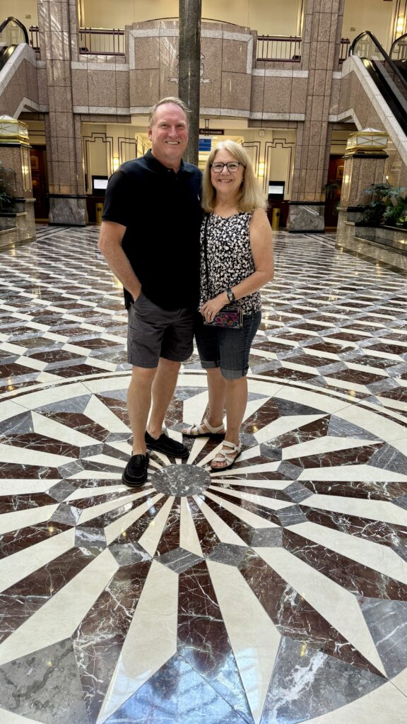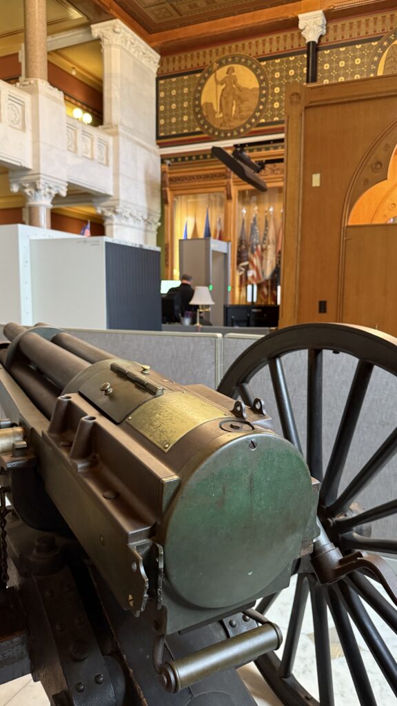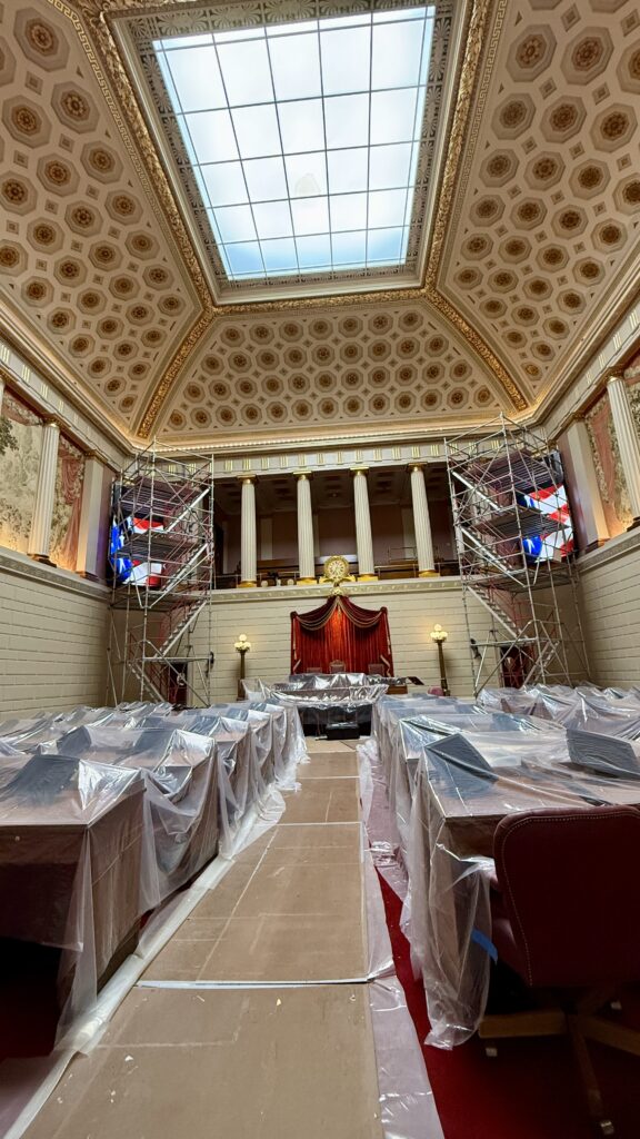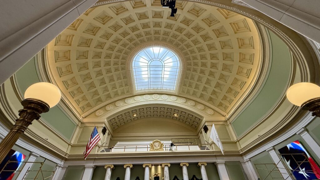 The Senate Chamber looks bigger than the House in these pictures, but it’s actually smaller. There are 38 members of the Senate. Inspired by the Pantheon in Rome, this room has been restored to its original colors and finishes. Uniquely, the senate gallery is above the rostrum, meaning those watching from above cannot see the speaker. In all our tours, this was the first Capitol we have seen with that design.