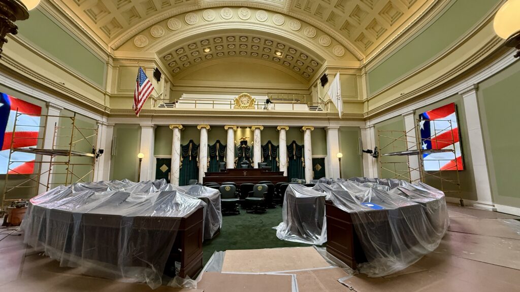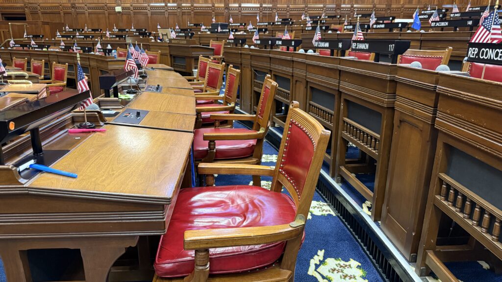 There was a lot of construction going on while we were in the building, so the Chambers were both in disarray. The House has 75 members; each Rep has their own solid oak desk.