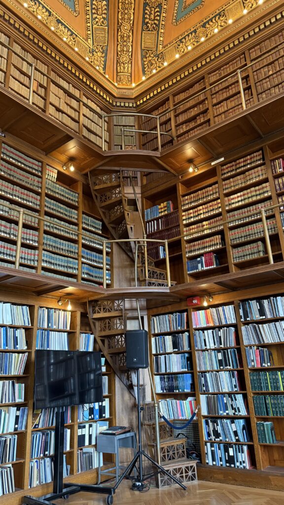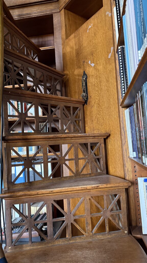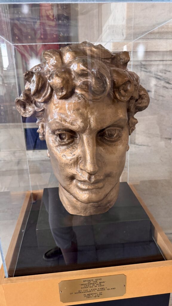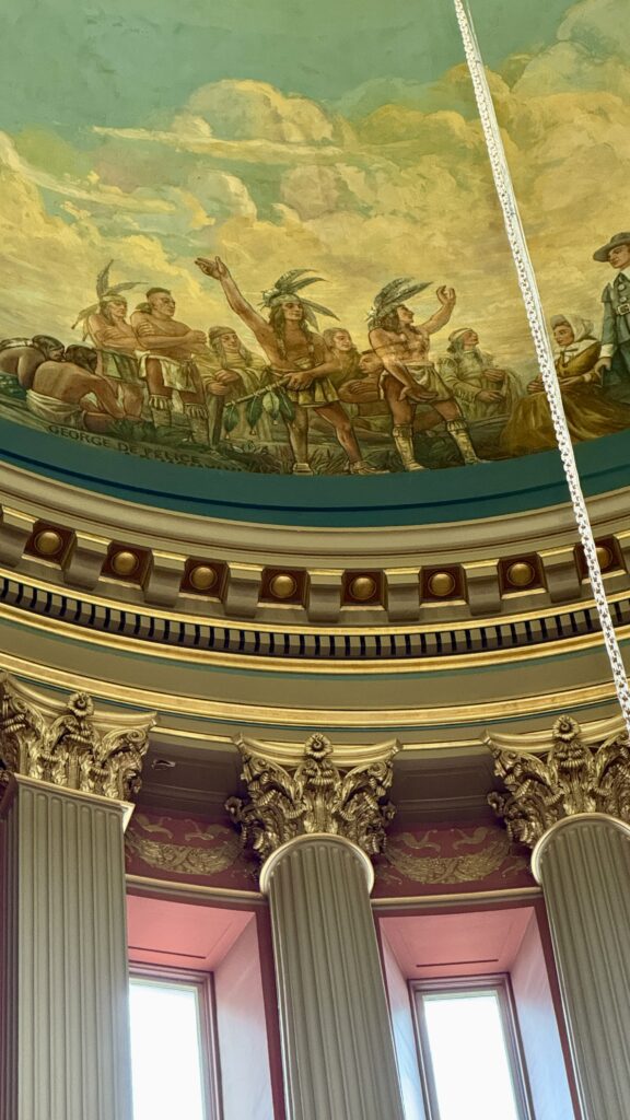My librarian friends may enjoy reading this! This library is part of the Secretary of State’s office, and it is open to the public. The collections date back to 1750, focusing on the legislative history of Rhode Island and the United States. The library ceiling was designed to look like the back of a leather-bound book (can you picture it?). The 16 circles around its perimeter of the ceiling are European printer’s marks from the 15th-17th centuries. The stairways and catwalk supports are iron, painted to look like the rest of its mahogany interior. There is also a special exhibit here from the first manned lunar landing in 1969.