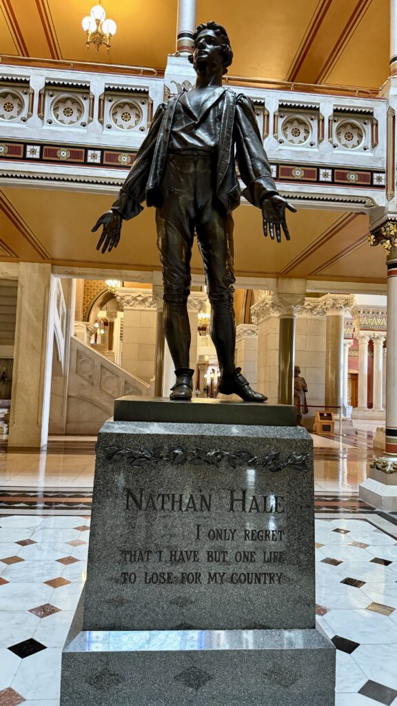 Nathan Hale is a Connecticut hero. He was a spy for George Washington during the Revolutionary War, captured and hanged by British soldiers while bravely stating that all-familiar quote, “I only regret that I have but one life to lose for my country.”
