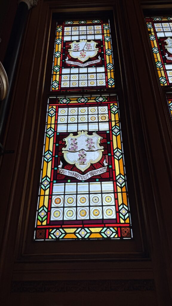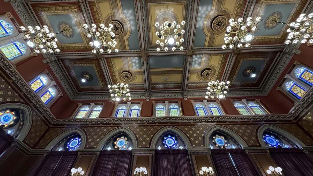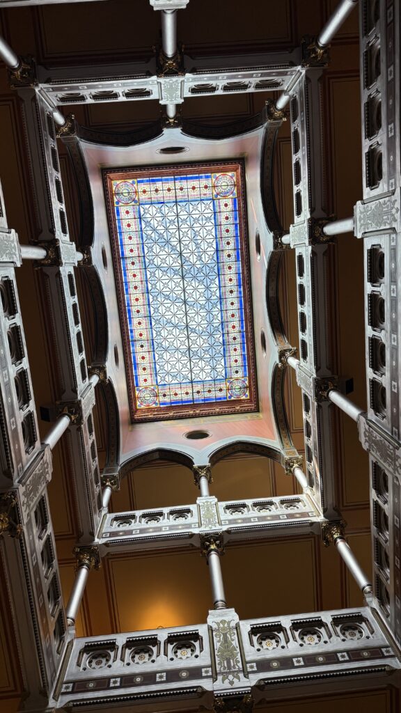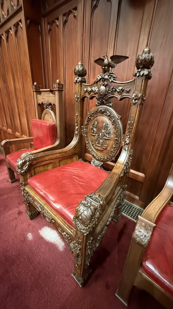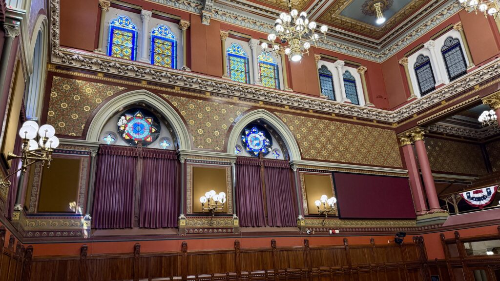 This room is also quite magnificent, with carved walnut paneling and ornate stenciling, stained glass windows, multiple state seals on the royal blue carpet, and the original desks of legislators still in use today. The gallery is on the floor above the rostrum, as it is in Rhode Island. Don’t pick your nose up there, or all the legislators will be able to witness it (haha).