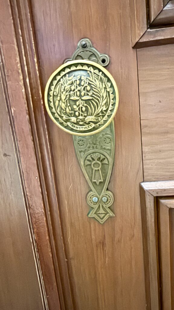 The tour guide was sure to point out some unique attention to details found in this room. The big mahogany doors are ornamental, with the state seal engravings on the hinges and doorknobs. The seal is also in the middle of the senate room, woven into the carpet. This room used to be the library, and was converted into the Senate Chamber in 1913.