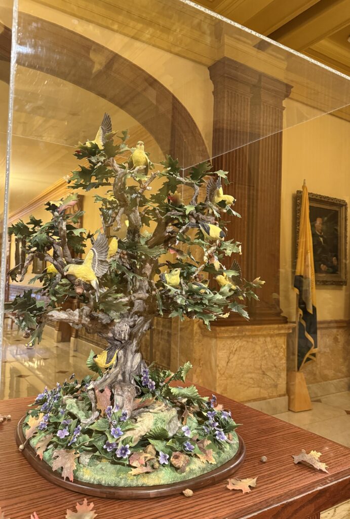 Step into the crossroads of the State House halls and you’ll spot a dazzling showstopper: a glass case holding “The Glory of New Jersey,” a porcelain masterpiece by Boehm Studio, crafted right in Trenton in 1995. This isn’t just any sculpture—it’s a vibrant northern oak (NJ state tree) loaded with 21 goldfinches (NJ state bird), each one representing a different New Jersey county. Look closer and you’ll find violets (NJ state flower) blooming at the roots, 13 honeybees symbolizing the original colonies, cranberries, horseshoe crabs, and—here’s a quirky touch—a single ladybug saluting New Jersey’s first female governor, Christine Todd Whitman. The whole thing stands three feet tall, weighs in at 75 pounds, and was brought to life by 12 artisans using 129 molds and 326 individual pieces. Now that’s Jersey pride, captured in porcelain!