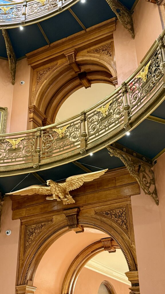 Step under the magnificent dome in the rotunda and you’re in for a treat! Our guide pointed out some quirky features, like the mysterious dragons woven into the architecture—no one really knows why, but legend has it these eastern dragons are guardians of humanity. 🐉✨ Over the door, an eagle stands watch where the main entrance used to be, although now the dome sits off-center after years of expansions. And get this: Tim swears the dome towers a whopping 140 feet overhead! Who knew state history could be so whimsical?